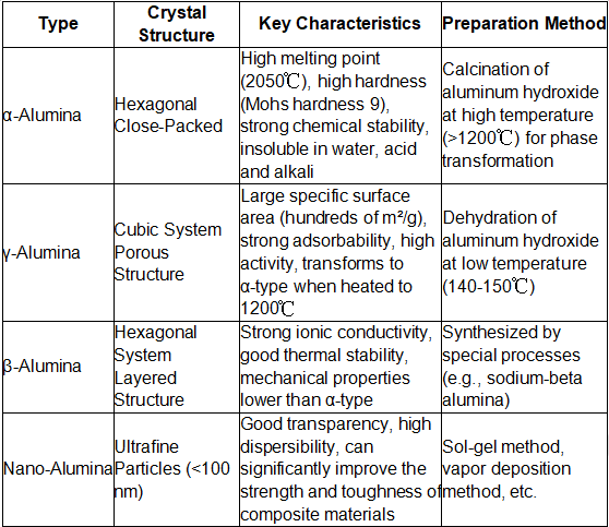 De kernclassificatie van aluminiumoxidepoeder is gebaseerd op de kristalstructuur en het bereidingsproces. Veel voorkomende typen en hun kenmerken zijn als volgt: